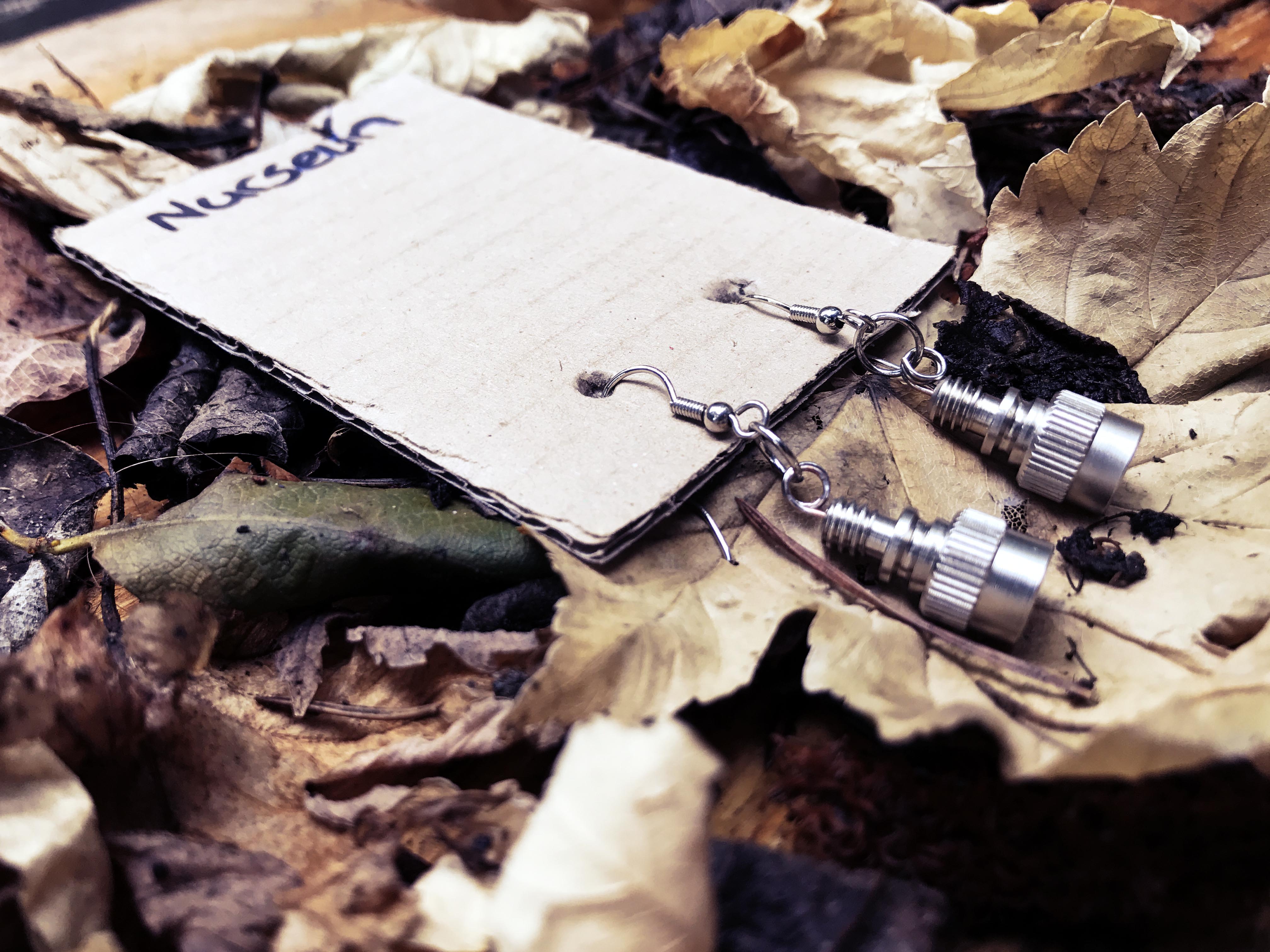 Dit is een zilveren oorbel. Gemaakt van een verloopnippel van een fietsventiel.